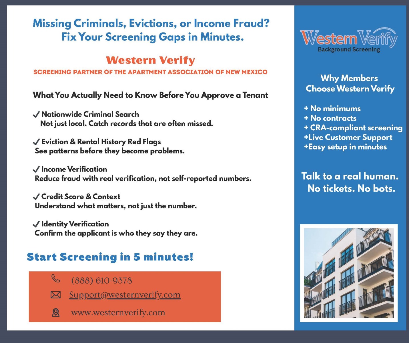 AANM works with industry-leading screening providers. Provide online delivery and technical support with no annual or monthly fees. A portion of the screening fees directly benefits your Apartment Association of New Mexico.